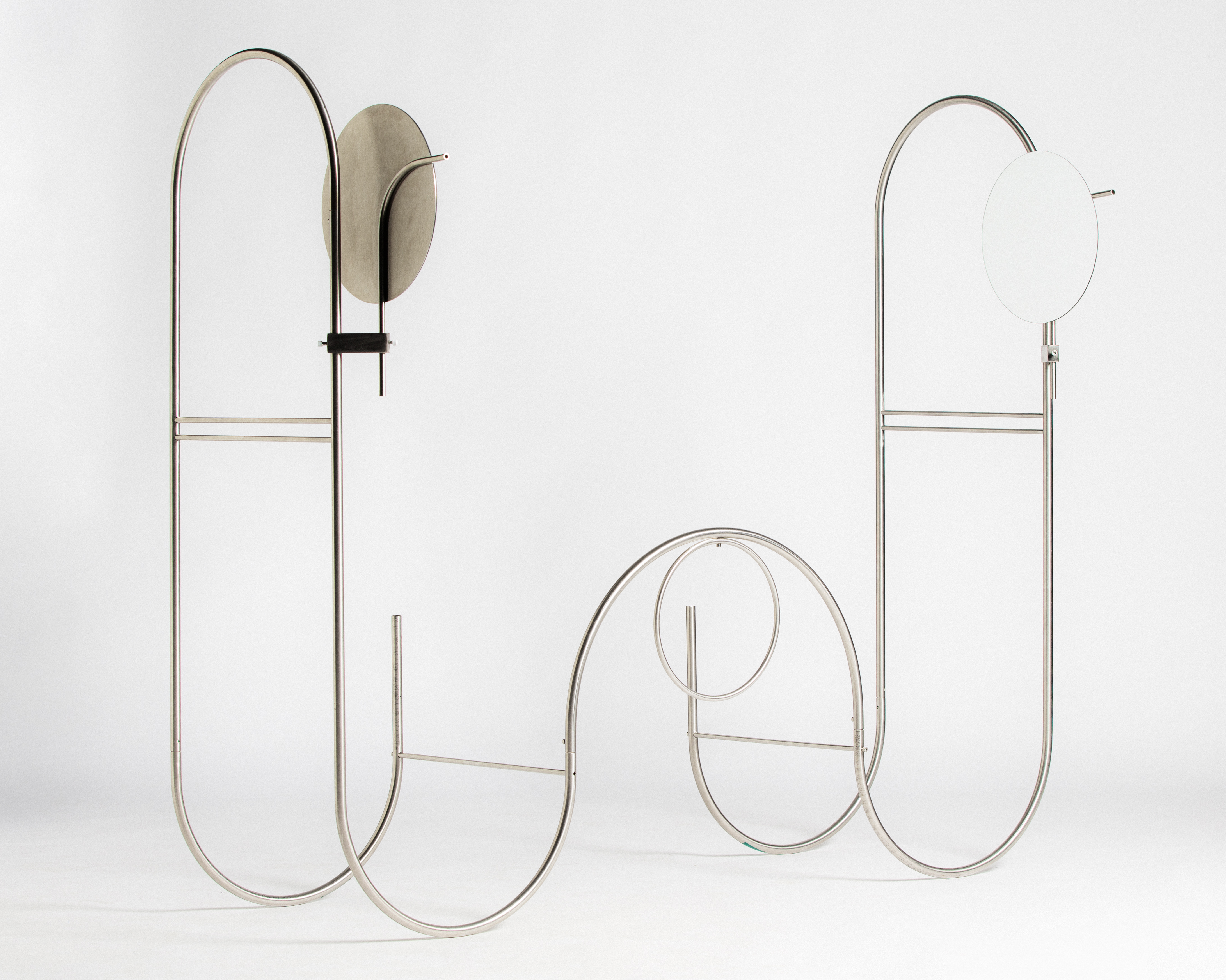 The piece is built from eight tubular steel elements that can be assembled and disassembled. Its looping form echoes the proportions and relationship between the uterus and ovaries, using circular geometry to speak about origin, connection, and repetition.