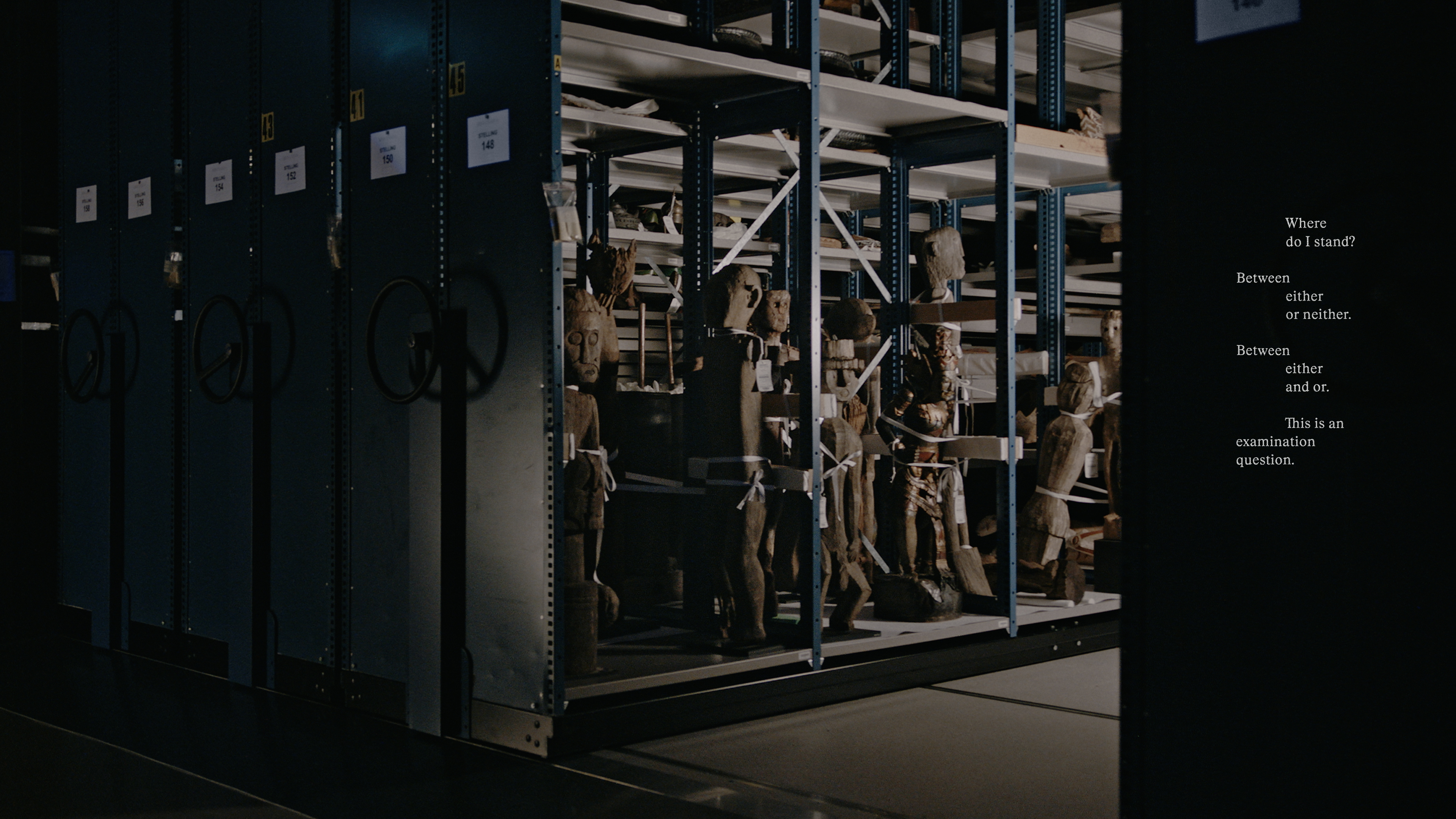 Consider this exhaustive labyrinth of gaining access: almost one year of unanswered and delayed communications, followed by two years of bureaucratic negation before the filmmaker could finally breach these storage buildings of cultural seclusion. In conversation with Mirelle, she speaks of experiencing an institutional fear, which she carefully left vague. However, I observe this anxiety as an echo of the colonial logic’s fear of perpetual vigilance against uprising, the persistent dread that haunts colonial power. It is the fear of never knowing when the subjugated might reclaim what was violently appropriated. Or, in other words, when the colonised might challenge the coloniser’s narrative of authority. I cannot de-link this institutional fear Mirelle experienced, together with the secrecy surrounding these buildings, from the continuation of the colonial fear of being confronted, of being held accountable, of losing control over the narrative.