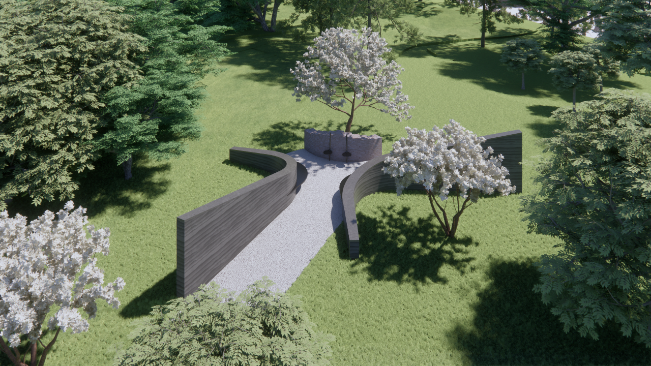 Samuel Adams Memorial, Oakville, Ontario, Canada - SOCA designed a memorial to Samuel Adams, an African American blacksmith who migrated to Canada in the 1850's via the Underground Railroad and settled in Oakville Ontario. The design uses salvaged foundation stones from the recently demolished Adams family home, anchoring the site with authentic material memory. These stones are framed by newly constructed rammed earth walls that evoke permanence and craft. Sculptural iron seating gestures to Adams’ blacksmithing trade and longer histories of African ironwork; Rendering by SOCA