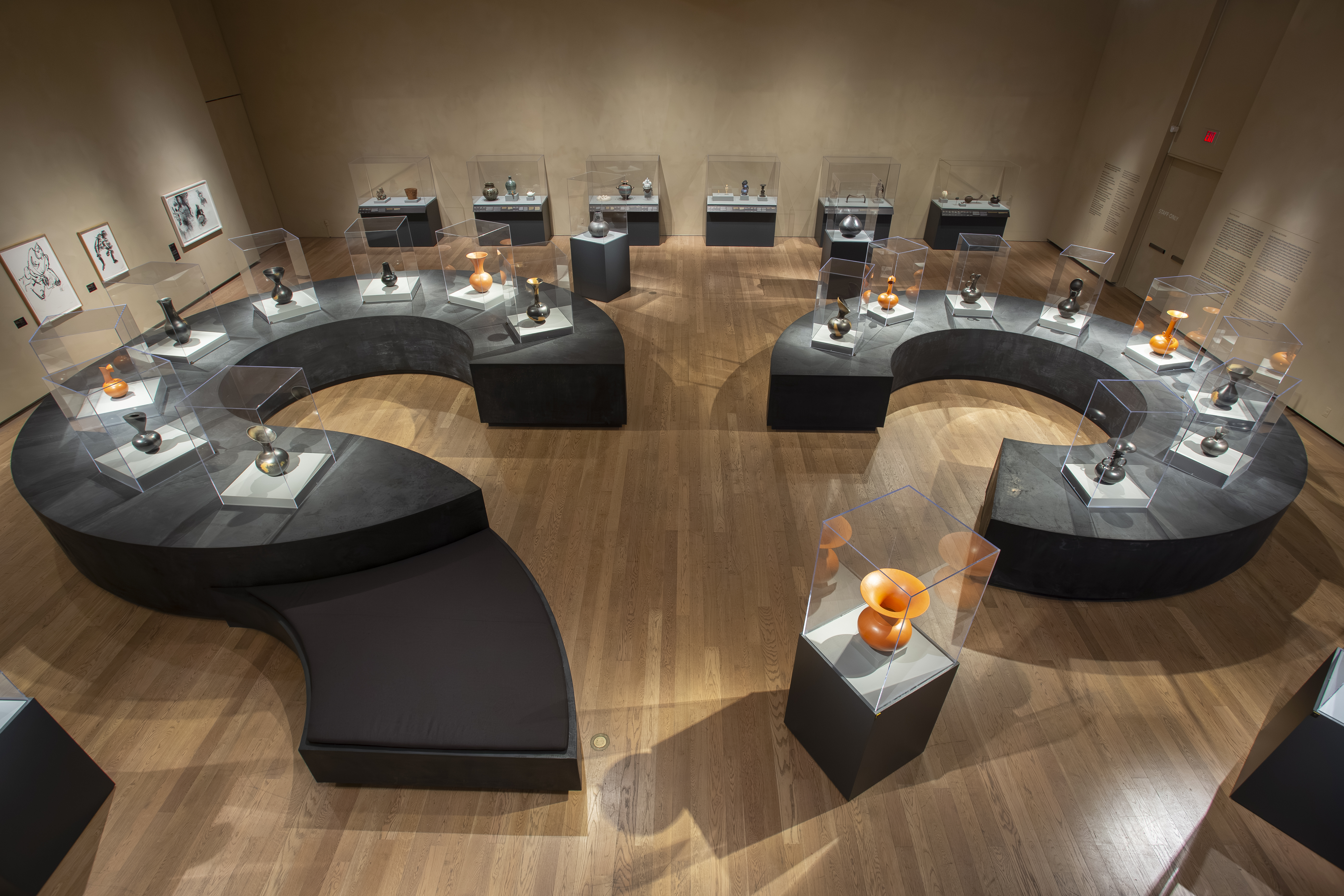 Magdalene Odundo: A Dialogue with Objects at the Gardiner Museum in Toronto - SOCA designed exhibition. The design transforms the white cube space into a 'clay cube' treating the walls with textured limewash paint and creating broken circular plinths covered in dark plaster which pick up on the metallic quality of Odundo's vessels; Photo by Jack McCombe
